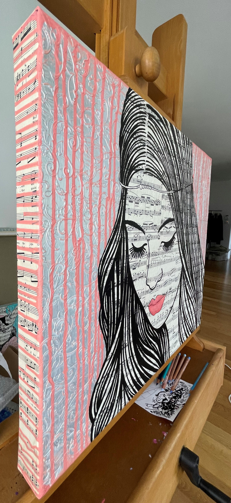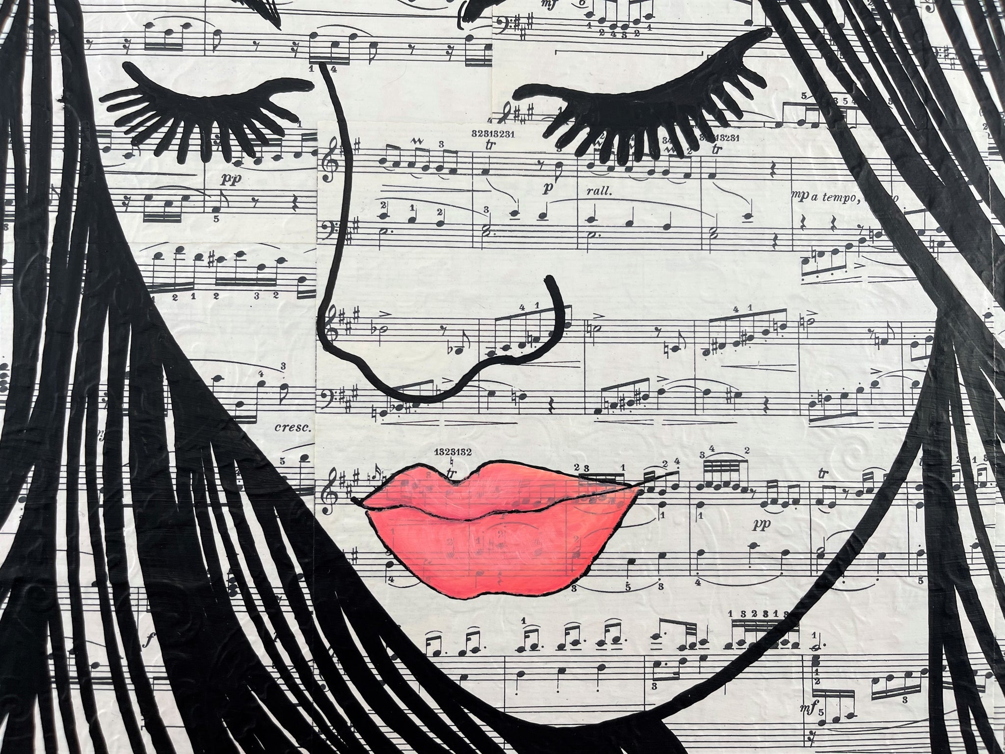 Martina's works are acrylic paintings on a highly textured very unique patterned background using vintage sheet music, a medium she prefers due to the aged character of old paper from all over the world. Her major themes are life, emotions, feelings, relationships, moments and events that impact her inspiration. Her paintings are collected throughout the World, and can be found in many public, corporate and private collections. She is represented by 4 galleries (USA, UK, Holland and Switzerland) and showed her work at Affordable Art Fairs in Amsterdam, Brussels, London Battersea and London Hampstead.