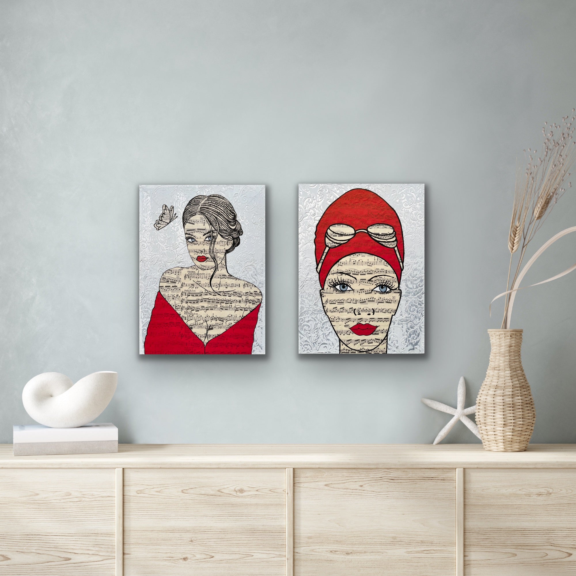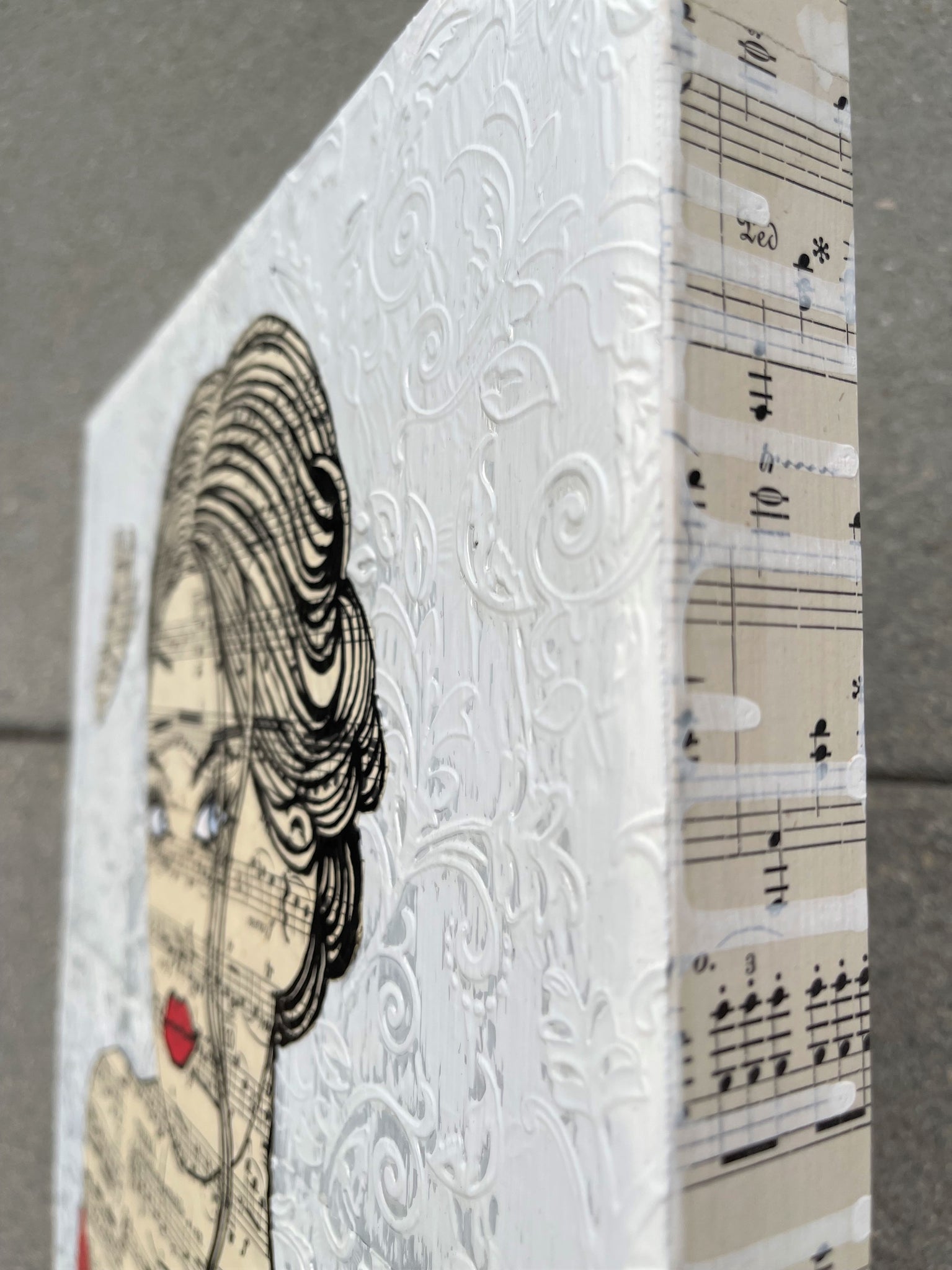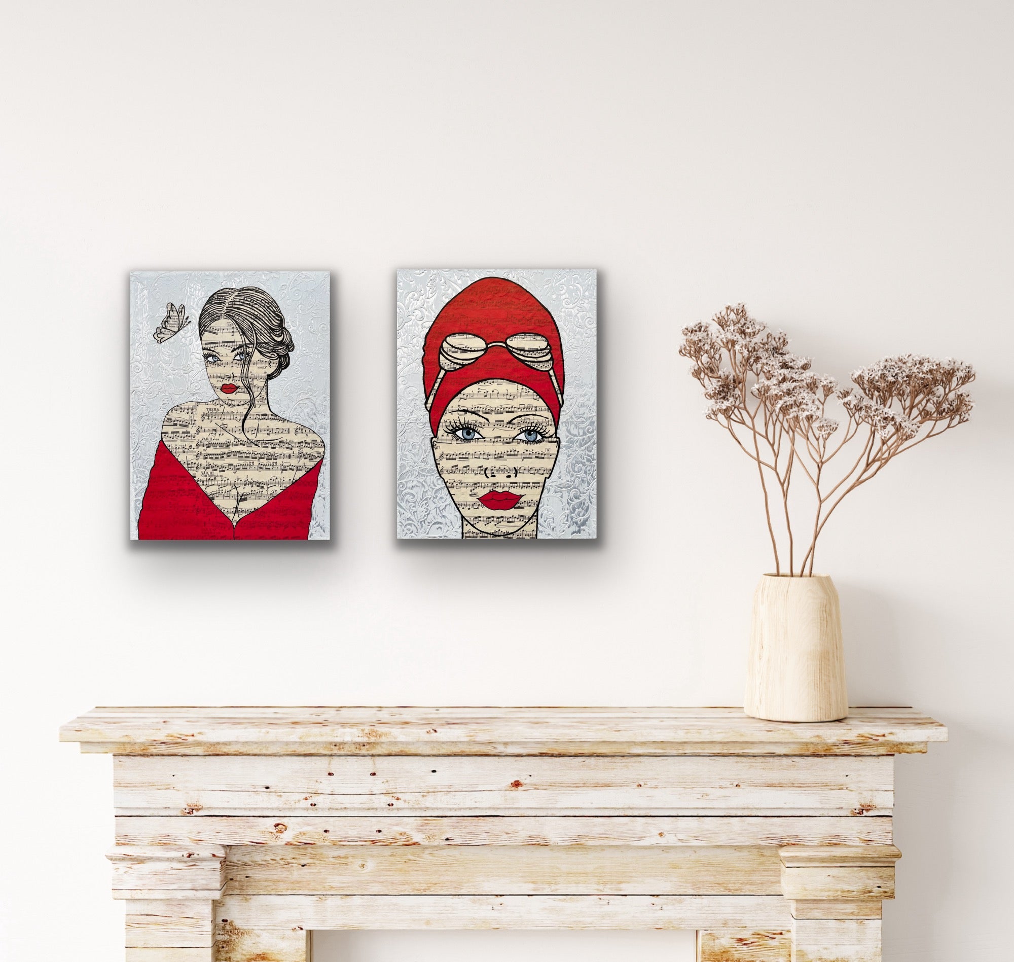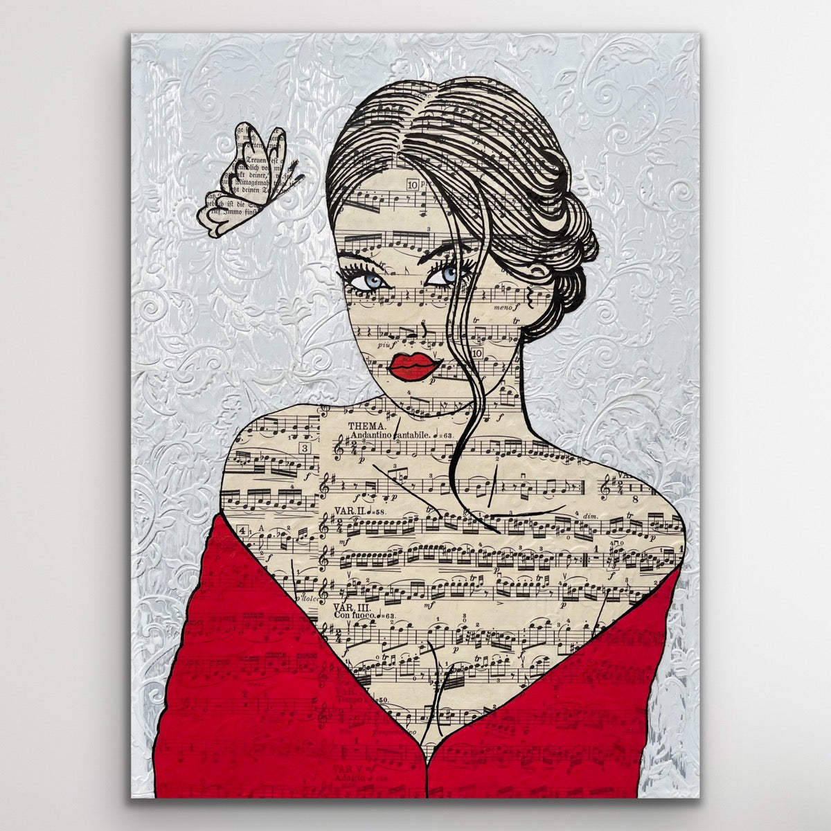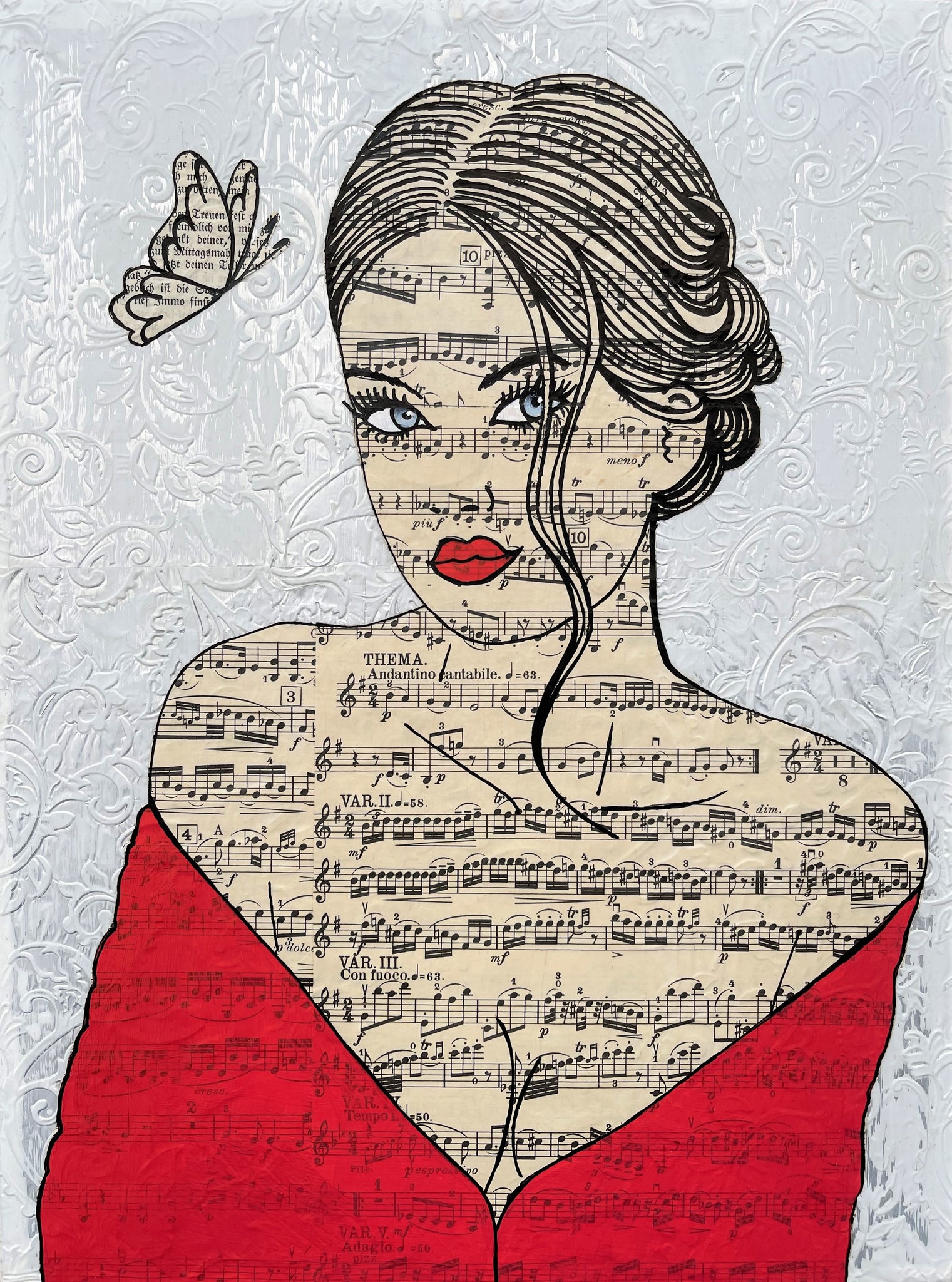 Martina's works are acrylic paintings on a highly textured very unique patterned background using vintage sheet music, a medium she prefers due to the aged character of old paper from all over the world. Her major themes are life, emotions, feelings, relationships, moments and events that impact her inspiration. Her paintings are collected throughout the World, and can be found in many public, corporate and private collections. She is represented by 4 galleries (USA, UK, Holland and Switzerland) and showed her work at Affordable Art Fairs in Amsterdam, Brussels, London Battersea and London Hampstead.