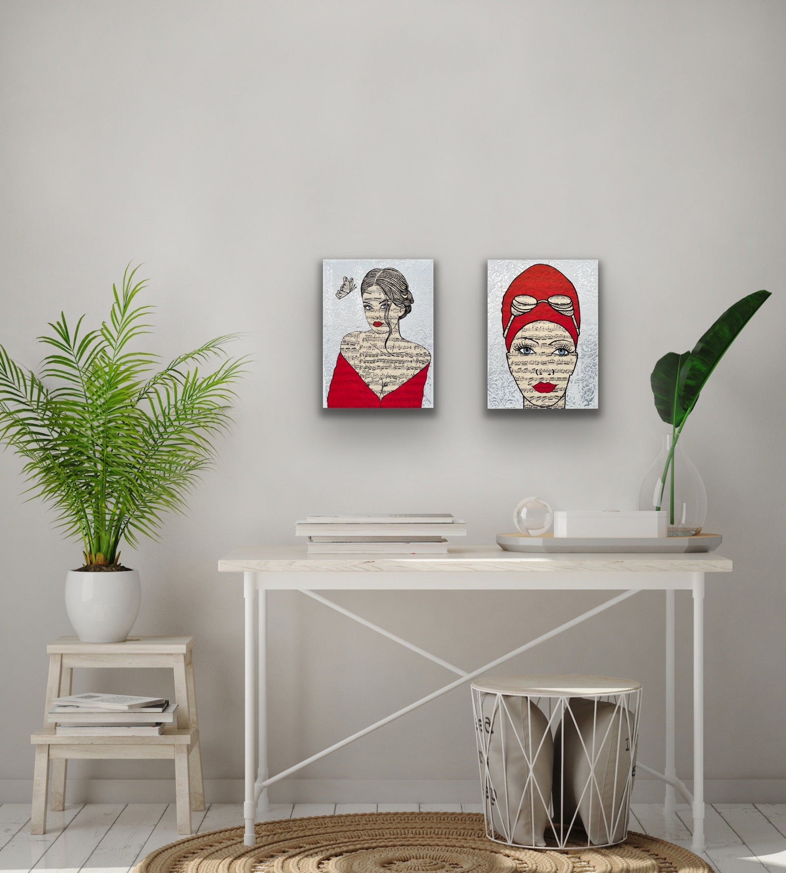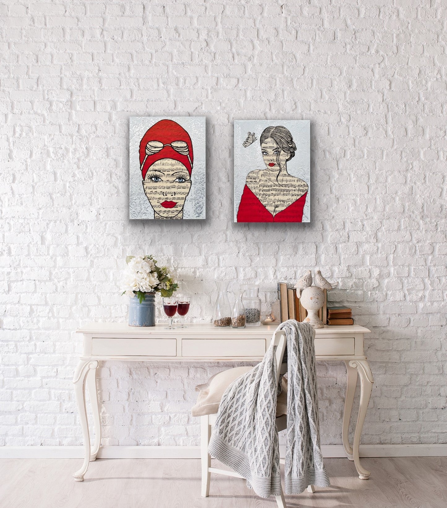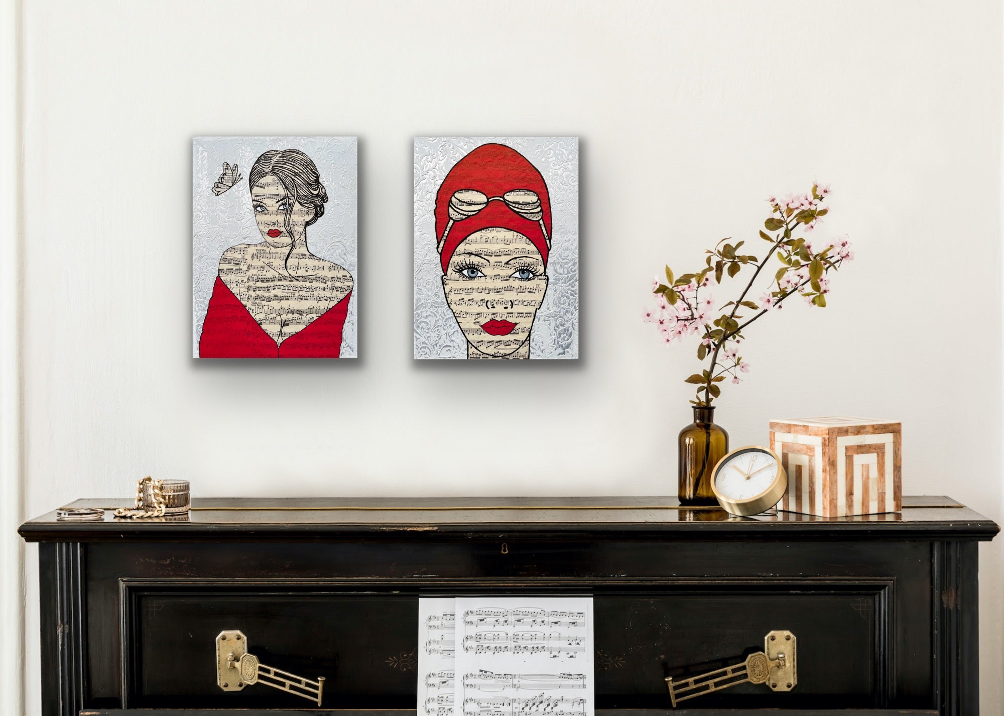 Martina's works are acrylic paintings on a highly textured very unique patterned background using vintage sheet music, a medium she prefers due to the aged character of old paper from all over the world. Her major themes are life, emotions, feelings, relationships, moments and events that impact her inspiration. Her paintings are collected throughout the World, and can be found in many public, corporate and private collections. She is represented by 4 galleries (USA, UK, Holland and Switzerland) and showed her work at Affordable Art Fairs in Amsterdam, Brussels, London Battersea and London Hampstead.