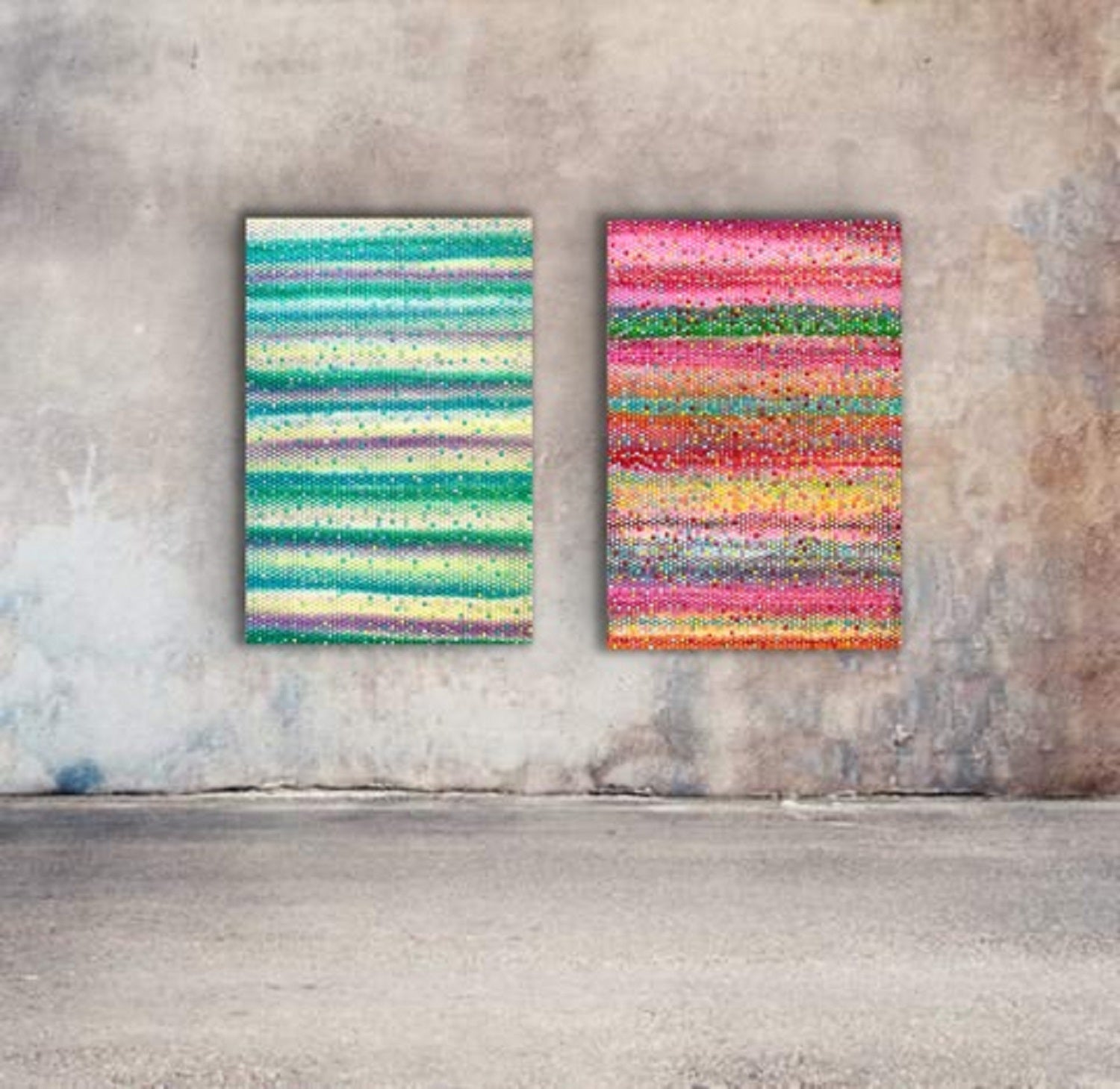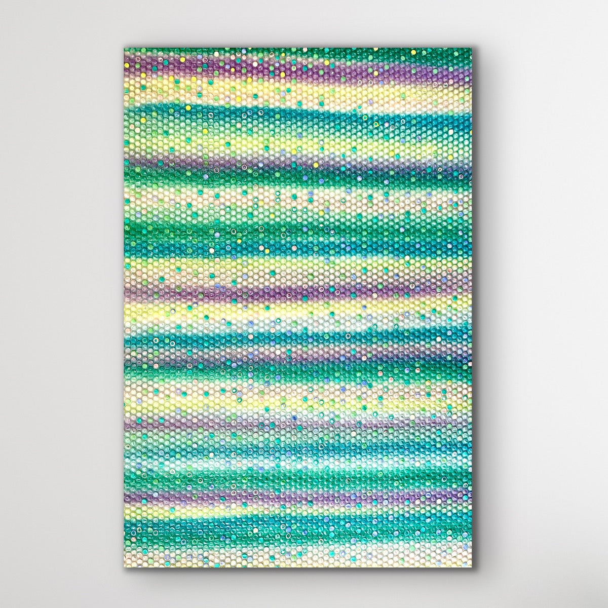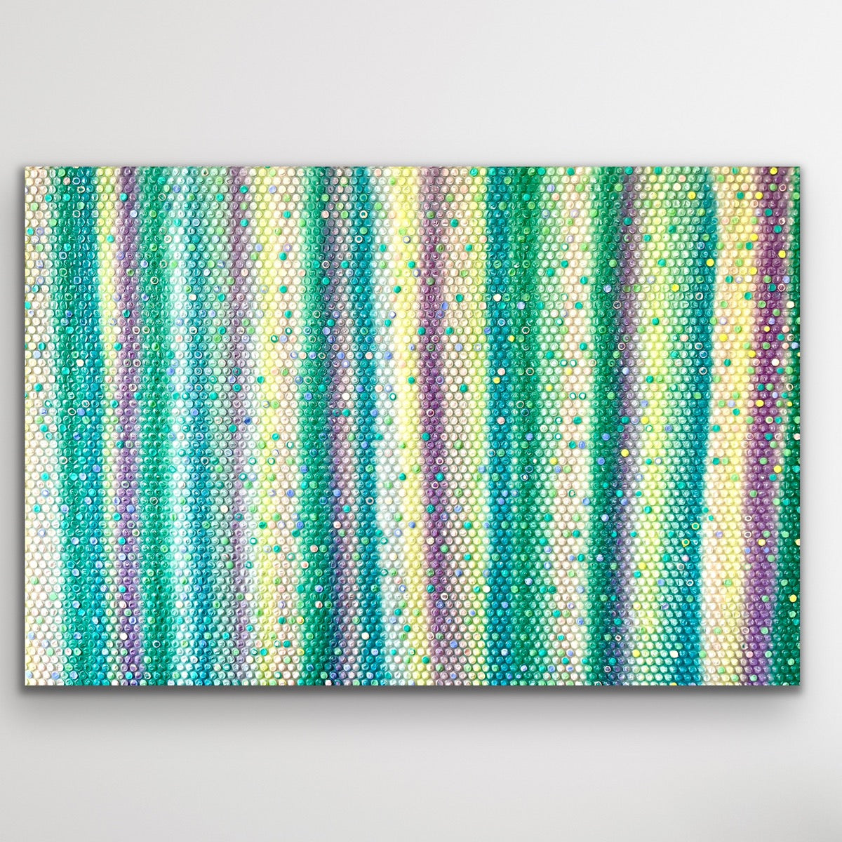 Niederhauser builds layers from the surface of each canvas to present dots of color that appear in 3D. This manipulation of space through color change and combination challenges the viewer’s perception of depth.