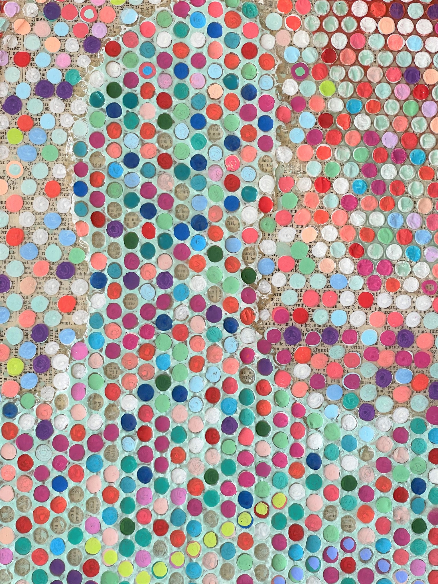 The base layer of this work is a collage of bookpages, I add bubble wrap paper and 4 layers of highest grade artist resin. Most bubbles are fully coveres with resin ans swim in it and are still visible as bubbles, in some parts of the artwork the bubbles are half in the resin. It gives a really nice play. The bookpages are on some parts still visible. I love how it turned out.