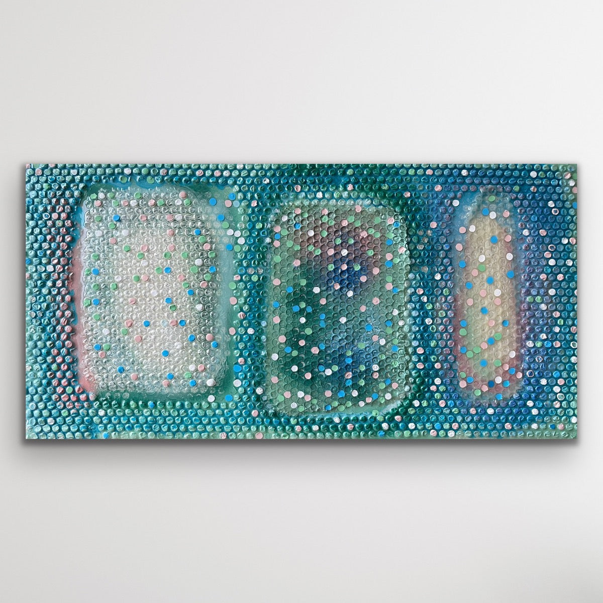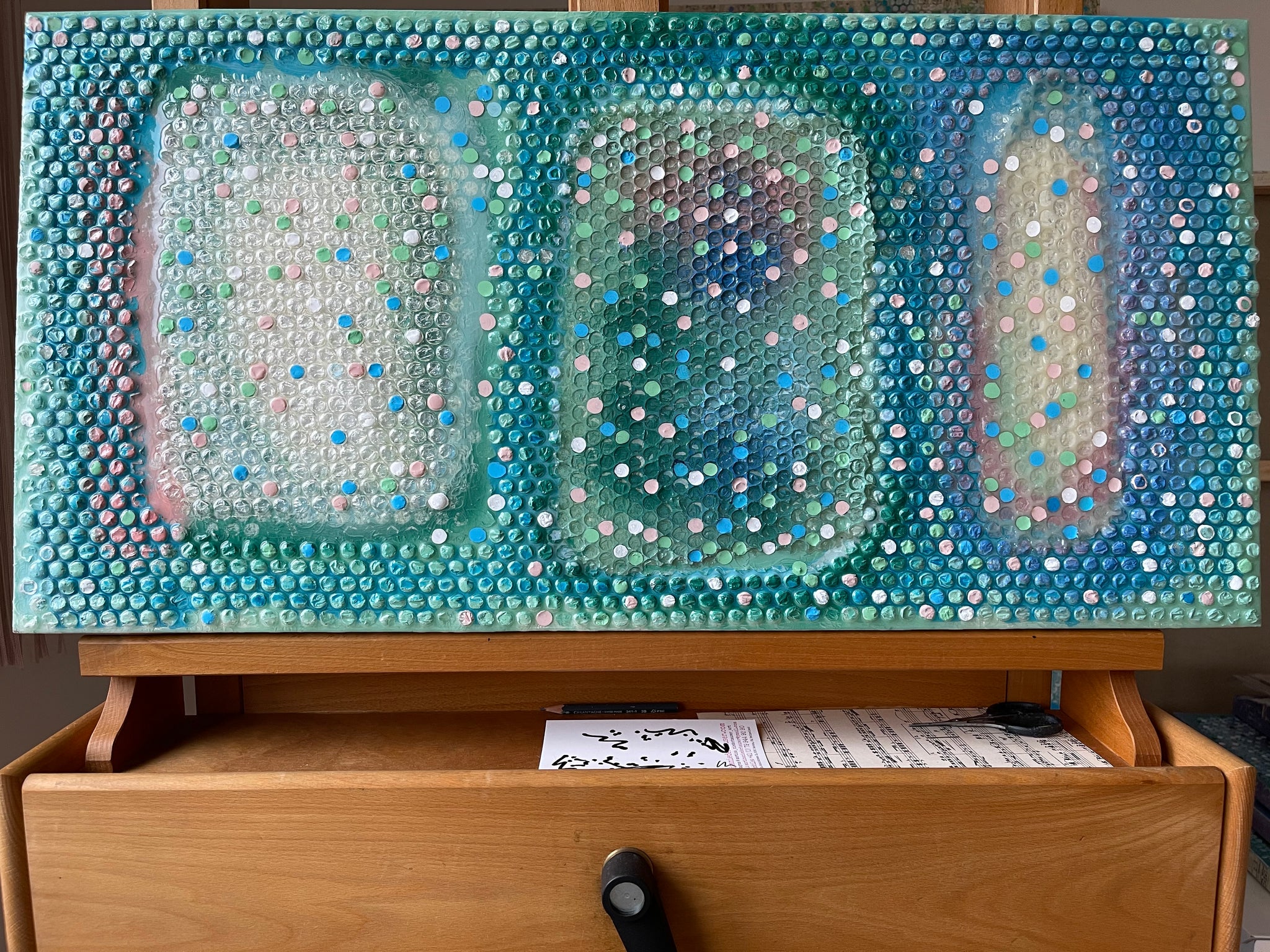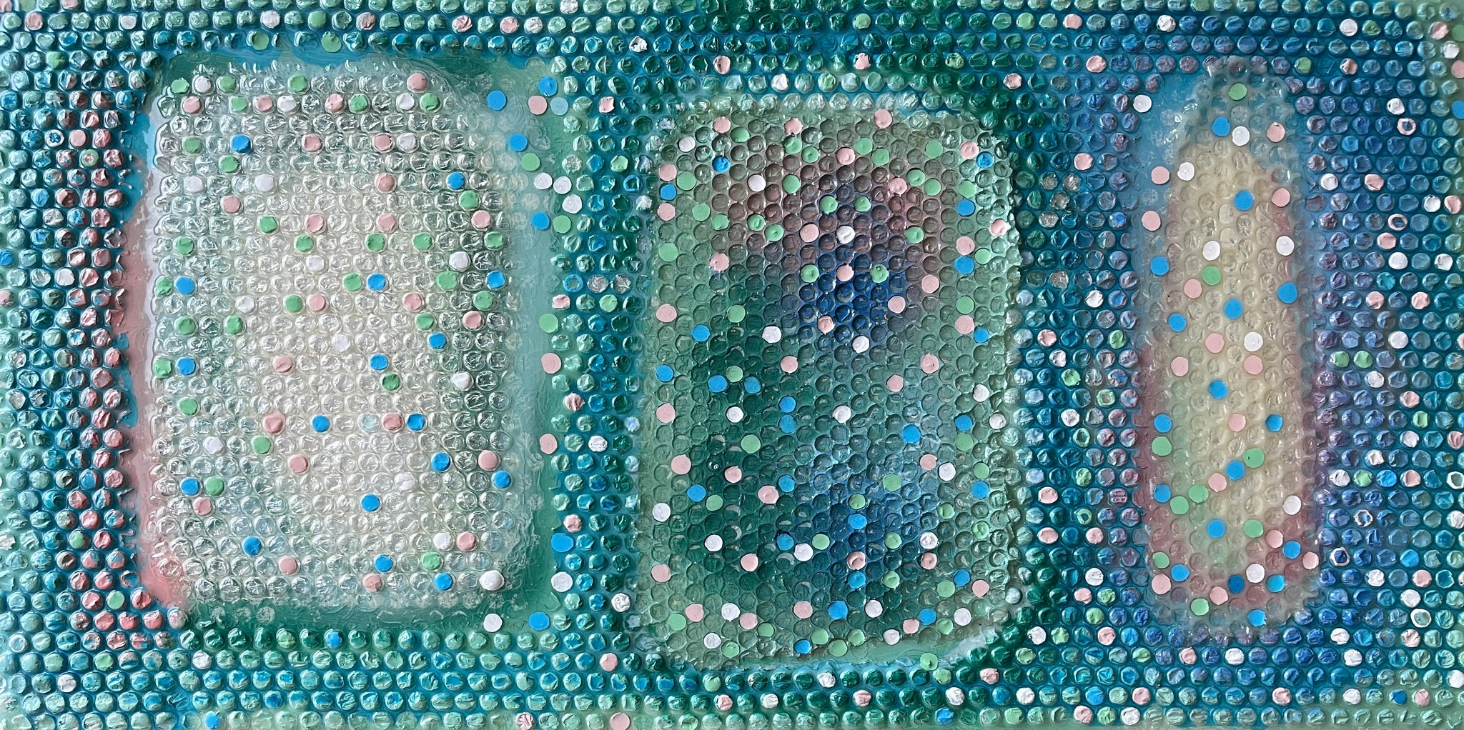 I was very fascinated during packing of artworks to send overseas and discovered the bubble wrap paper with dot bubbles and started to paint on those. It ended up with my new successful collection.