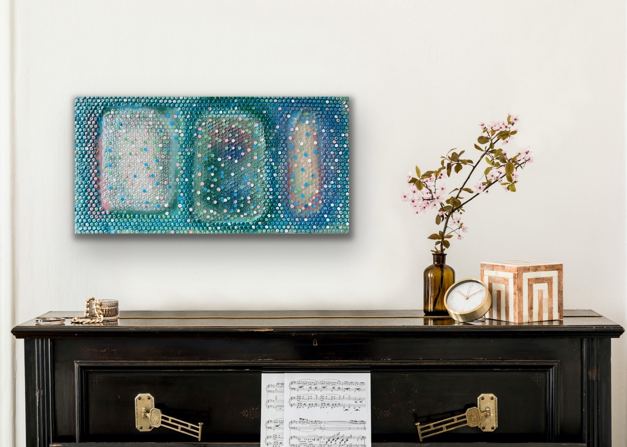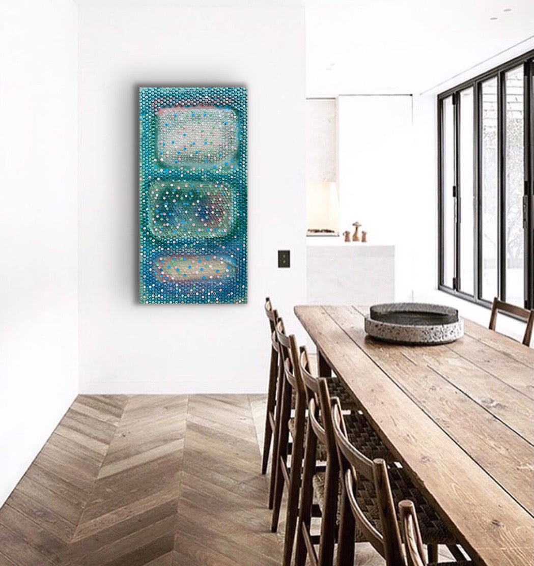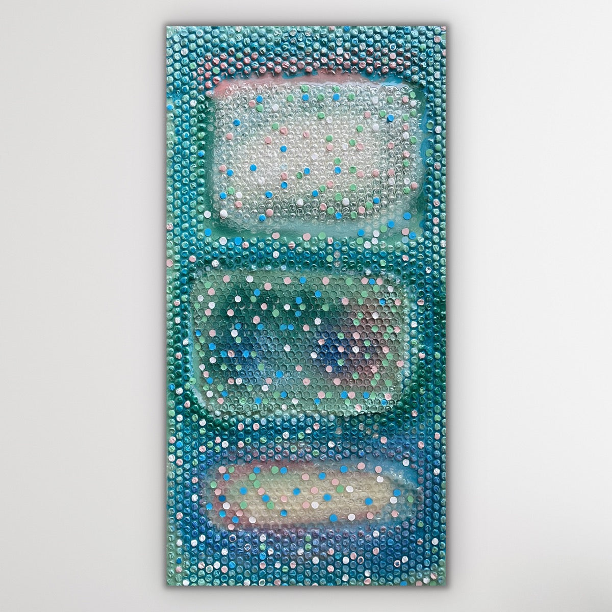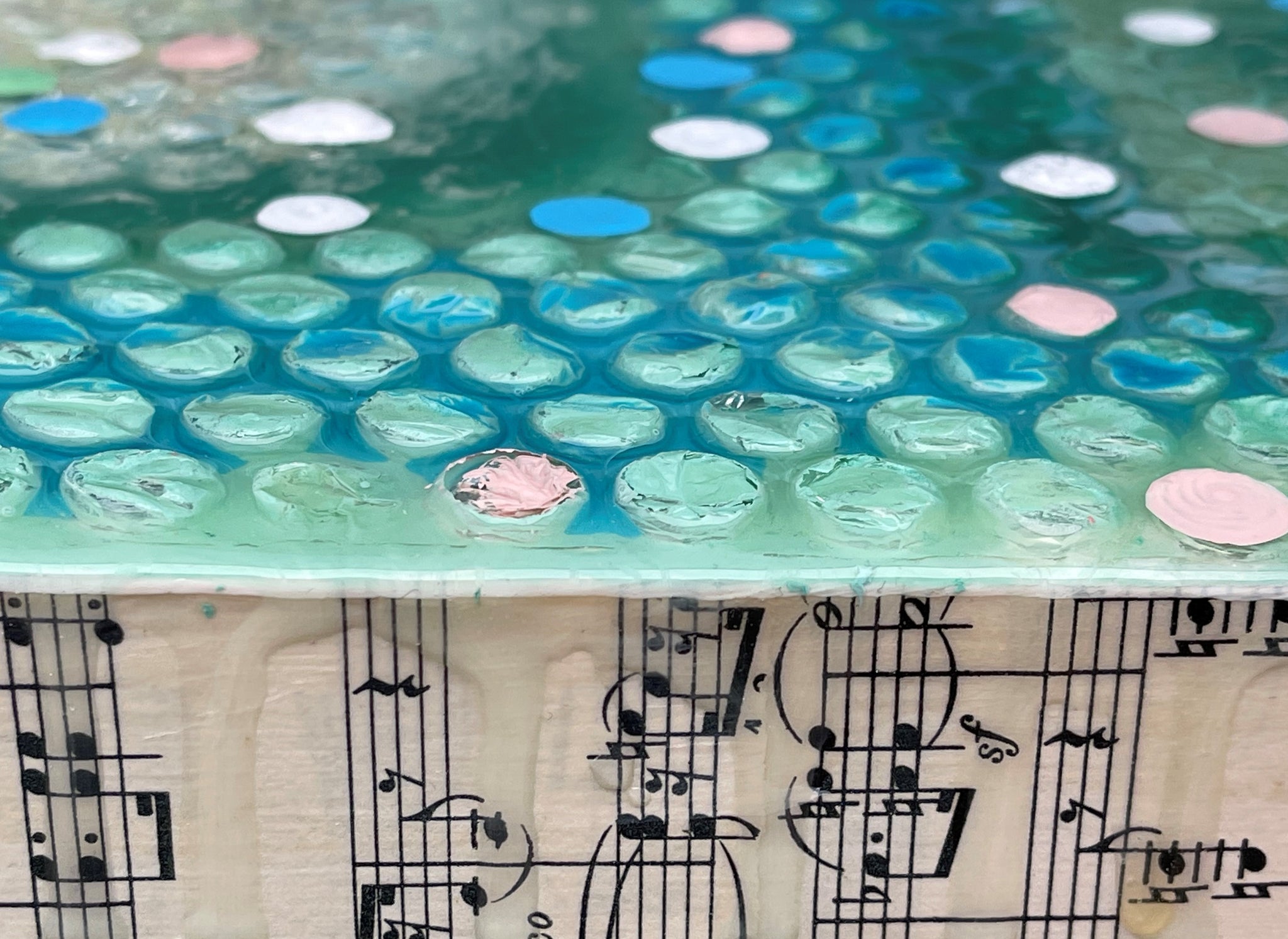 The base layer of this work is a collage of 3 D pattern, I add bubble wrap paper and 3 layers of highest grade artist resin. Some bubbles are almost coveres in the resin and swim in it and are still visible as bubbles, in some parts of the artwork the bubbles are half in the resin. It gives a really nice play. I love how it turned out.